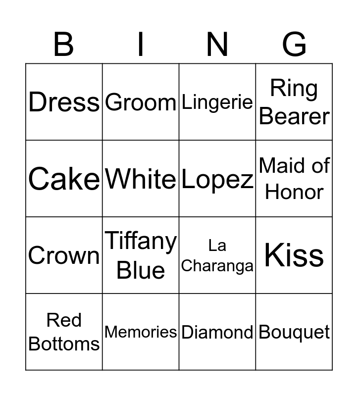 This bingo card has 64 words: Free!, Cafecito con Pan, Bride, Veil, Dance, Reception, Groom, Bridesmaid, Maid of Honor, Something Blue, Something Borrowed, Ring, Diamond, Cake, Present, White, Kiss, Dress, Heels, Crown, Flowers, Bouquet, Ring Bearer, Bridal Shower, Love, Bride & Co, Decorations, Roses, Bow Tie, Something Old, Champagne, Hilachas, Arroz, Pozole, Tiffany Blue, Berta Lidia, Beba, Liz, Aguin, Lopez, La Charanga, Memories, Flower Girl, Lace, Party Bus, Red Bottoms, Aisle, Band, Mariachis, DJ, Guest book, Proposal, Honeymoon, Cake Pops, Cupcakes, Cookies, Lingerie, Invitations, Jewelry, Wedding, Candles, Fiancee, I Do and Tie the Knot.