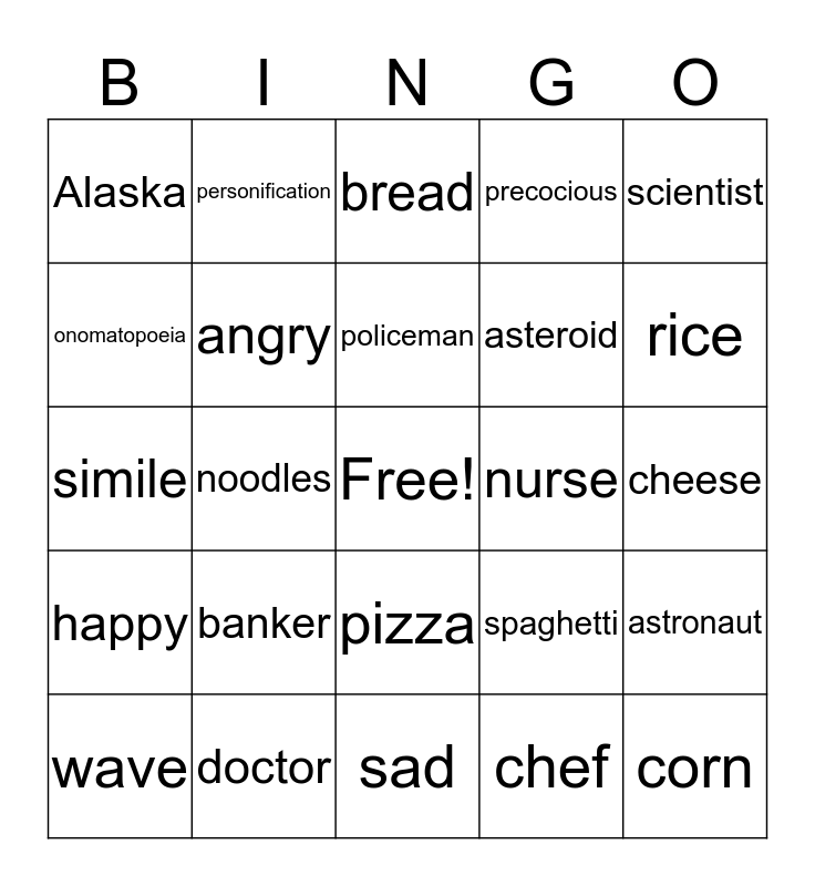 This bingo card has a free space and 42 words: Occupation, policeman, cashier, banker, chef, astronaut, corn, sandwich, bread, pizza, cheese, rice, noodles, scientist, fireman, spaghetti, ice cream, simile, metaphor, personification, onomatopoeia, alliteration, salmon, Alaska, Utah, tides, asteroid, Comet, oxygen, nitrogen, rotation, happy, angry, sad, handshake, wave, doctor, nurse, businessperson, veterinarian, precocious and atrocious.