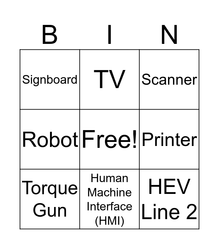 This bingo card has a free space and 8 words: Printer, Scanner, TV, Torque Gun, Signboard, HEV Line 2, Robot and Human Machine Interface (HMI).