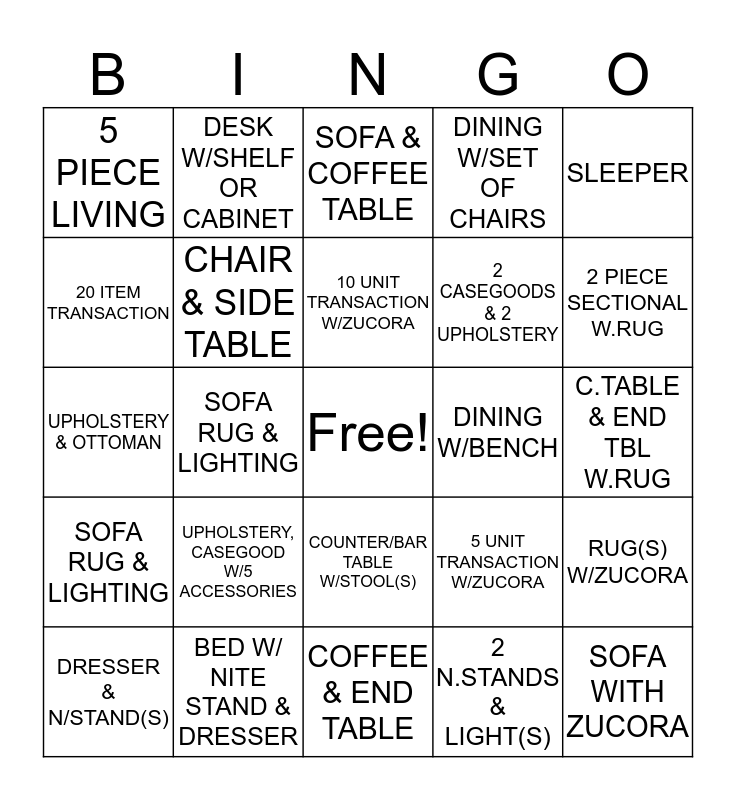 This bingo card has a free space and 25 words: UPHOLSTERY, CASEGOOD W/5 ACCESSORIES, COFFEE & END TABLE, 10 UNIT TRANSACTION W/ZUCORA, DRESSER & N/STAND(S), SLEEPER, 5 PIECE LIVING, 20 ITEM TRANSACTION, DESK W/SHELF OR CABINET, DINING W/BENCH, COUNTER/BAR TABLE W/STOOL(S), 2 CASEGOODS & 2 UPHOLSTERY, UPHOLSTERY & OTTOMAN, 5 UNIT TRANSACTION W/ZUCORA, RUG(S) W/ZUCORA, CHAIR & SIDE TABLE, 3 PIECE SECTIONAL, C.TABLE & END TBL W.RUG, SOFA & COFFEE TABLE, 2 PIECE SECTIONAL W.RUG, SOFA RUG & LIGHTING, SOFA WITH ZUCORA, BED W/ NITE STAND & DRESSER, SOFA RUG & LIGHTING, DINING W/SET OF CHAIRS and 2 N.STANDS & LIGHT(S).