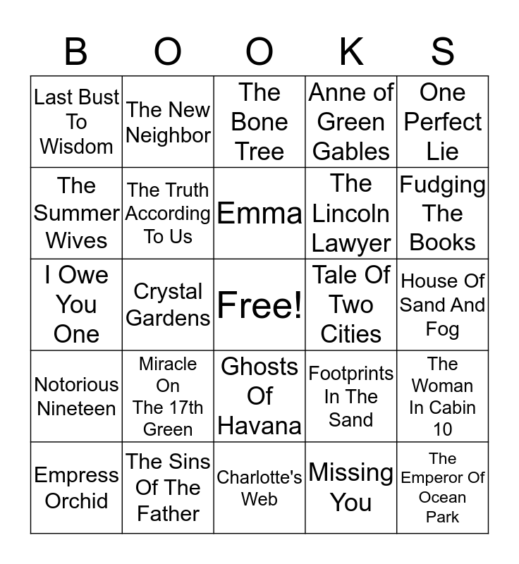 This bingo card has a free space and 24 words: Miracle On The 17th Green, The Sins Of The Father, Emma, Empress Orchid, One Perfect Lie, Last Bust To Wisdom, The Summer Wives, The New Neighbor, Tale Of Two Cities, Ghosts Of Havana, The Lincoln Lawyer, I Owe You One, Footprints In The Sand, The Woman In Cabin 10, The Truth According To Us, Missing You, House Of Sand And Fog, The Bone Tree, Fudging The Books, Crystal Gardens, The Emperor Of Ocean Park, Notorious Nineteen, Anne of Green Gables and Charlotte's Web.