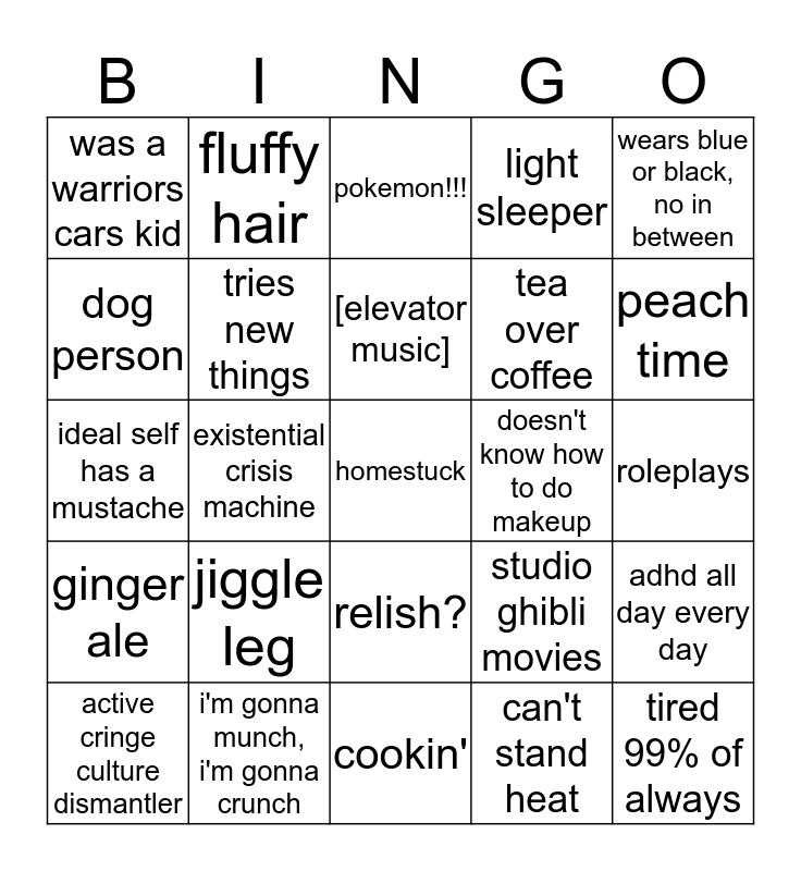 This bingo card has a free space and 24 words: jiggle leg, i'm gonna munch, i'm gonna crunch, [elevator music], active cringe culture dismantler, wears blue or black, no in between, was a warriors cars kid, dog person, fluffy hair, doesn't know how to do makeup, relish?, tea over coffee, ideal self has a mustache, studio ghibli movies, adhd all day every day, tries new things, can't stand heat, roleplays, pokemon!!!, peach time, existential crisis machine, tired 99% of always, ginger ale, light sleeper and cookin'.