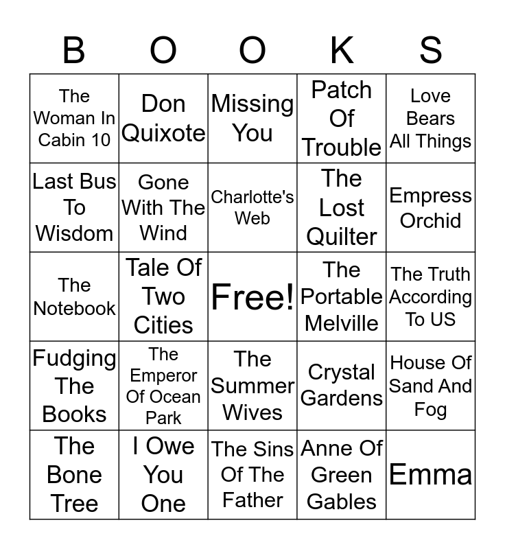 This bingo card has a free space and 24 words: The Emperor Of Ocean Park, I Owe You One, Charlotte's Web, The Bone Tree, Love Bears All Things, The Woman In Cabin 10, Last Bus To Wisdom, Don Quixote, The Portable Melville, The Summer Wives, The Lost Quilter, The Notebook, Crystal Gardens, House Of Sand And Fog, Gone With The Wind, Anne Of Green Gables, The Truth According To US, Missing You, Empress Orchid, Tale Of Two Cities, Emma, Fudging The Books, Patch Of Trouble and The Sins Of The Father.