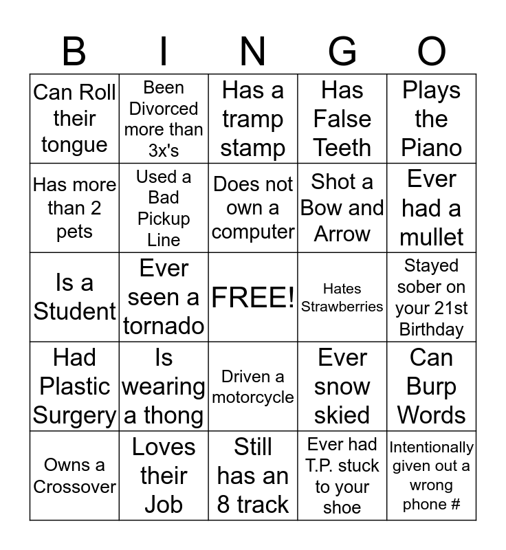 This bingo card has a free space and 24 words: Is wearing a thong, Loves their Job, Does not own a computer, Owns a Crossover, Plays the Piano, Can Roll their tongue, Has more than 2 pets, Been Divorced more than 3x's, Hates Strawberries, Driven a motorcycle, Shot a Bow and Arrow, Is a Student, Ever snow skied, Can Burp Words, Used a Bad Pickup Line, Ever had T.P. stuck to your shoe, Stayed sober on your 21st Birthday, Has a tramp stamp, Ever had a mullet, Ever seen a tornado, Intentionally given out a wrong phone #, Had Plastic Surgery, Has False Teeth and Still has an 8 track.