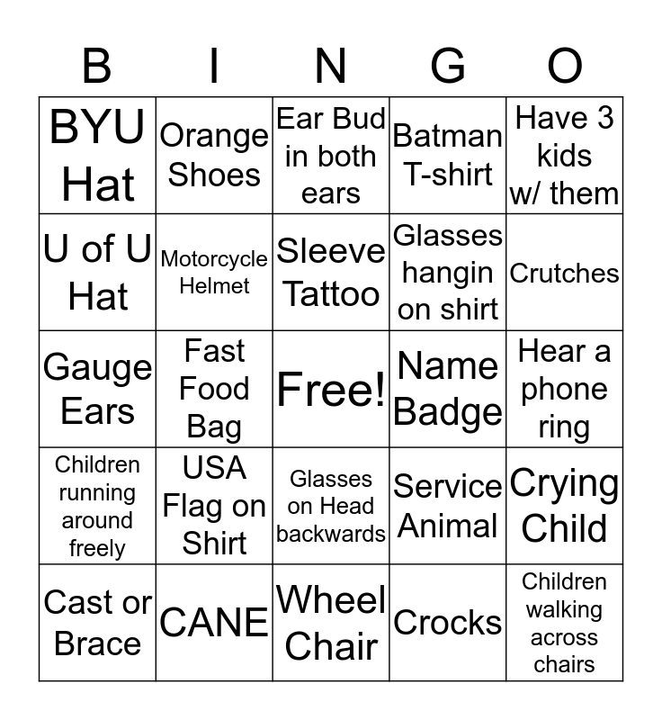 This bingo card has a free space and 24 words: USA Flag on Shirt, CANE, Sleeve Tattoo, Cast or Brace, Have 3 kids w/ them, BYU Hat, U of U Hat, Orange Shoes, Name Badge, Glasses on Head backwards, Glasses hangin on shirt, Gauge Ears, Service Animal, Crying Child, Motorcycle Helmet, Crocks, Hear a phone ring, Ear Bud in both ears, Crutches, Fast Food Bag, Children walking across chairs, Children running around freely, Batman T-shirt and Wheel Chair.