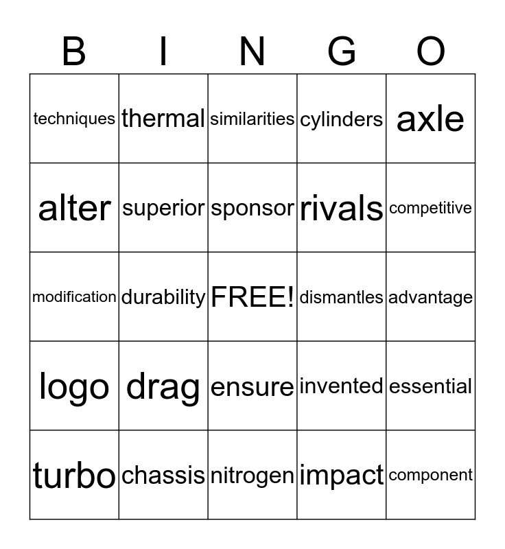 This bingo card has a free space and 24 words: drag, chassis, sponsor, turbo, axle, techniques, alter, thermal, dismantles, ensure, rivals, modification, invented, essential, superior, impact, advantage, similarities, competitive, durability, component, logo, cylinders and nitrogen.