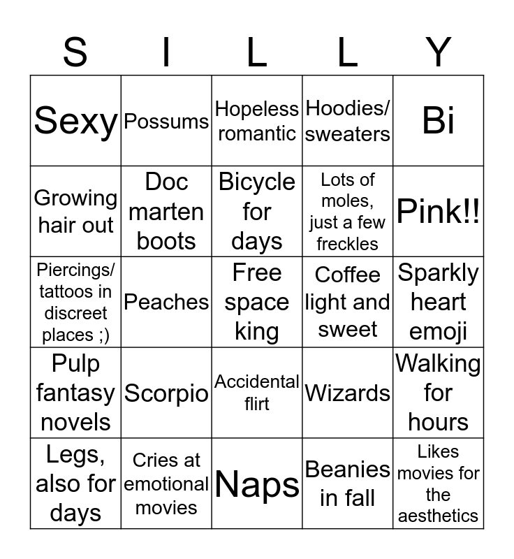 This bingo card has a free space and 24 words: Scorpio, Cries at emotional movies, Bicycle for days, Legs, also for days, Bi, Sexy, Growing hair out, Possums, Coffee light and sweet, Accidental flirt, Lots of moles, just a few freckles, Piercings/ tattoos in discreet places ;), Wizards, Walking for hours, Doc marten boots, Beanies in fall, Sparkly heart emoji, Hopeless romantic, Pink!!, Peaches, Likes movies for the aesthetics, Pulp fantasy novels, Hoodies/ sweaters and Naps.