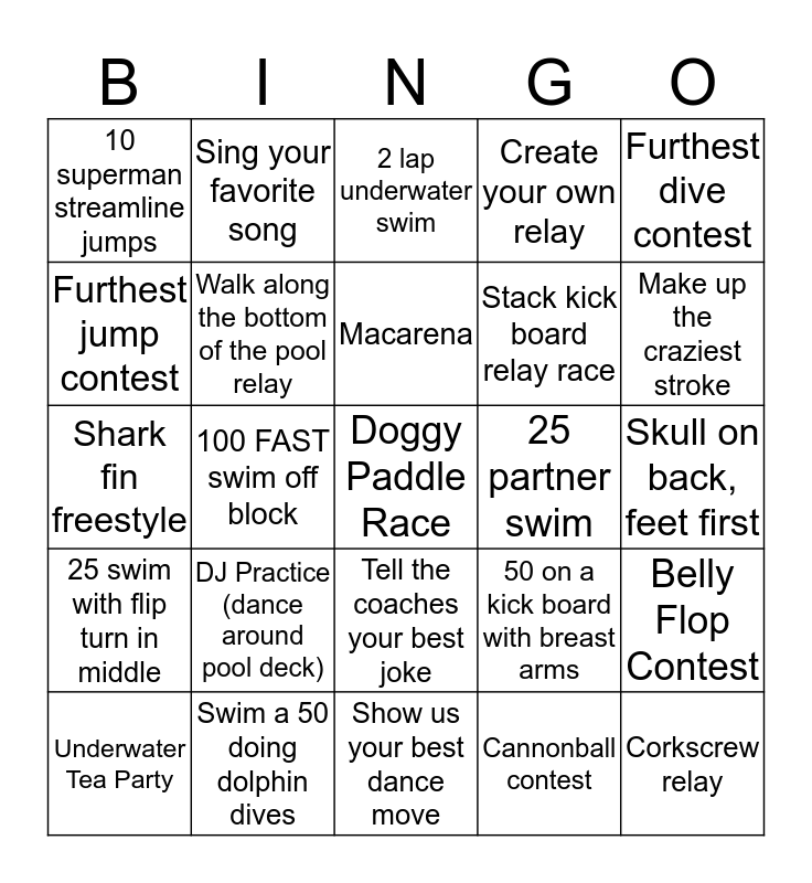 This bingo card has a free space and 24 words: DJ Practice (dance around pool deck), Swim a 50 doing dolphin dives, Macarena, Underwater Tea Party, Furthest dive contest, 10 superman streamline jumps, Furthest jump contest, Sing your favorite song, 25 partner swim, Tell the coaches your best joke, Stack kick board relay race, Shark fin freestyle, 50 on a kick board with breast arms, Belly Flop Contest, Walk along the bottom of the pool relay, Cannonball contest, Skull on back, feet first, 2 lap underwater swim, Make up the craziest stroke, 100 FAST swim off block, Corkscrew relay, 25 swim with flip turn in middle, Create your own relay and Show us your best dance move.