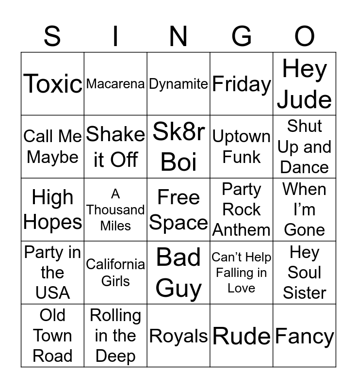 This bingo card has a free space and 29 words: Old Town Road, Meet Me in the Middle, A Thousand Miles, All Star, Toxic, Dynamite, Shake it Off, California Girls, Party Rock Anthem, Rolling in the Deep, When I’m Gone, Fancy, Royals, Rude, Shut Up and Dance, Havana, Bad Guy, Party in the USA, Hey Jude, High Hopes, Can’t Help Falling in Love, I Gotta Feelin, Uptown Funk, Call Me Maybe, Friday, Macarena, Hey Soul Sister, Sk8r Boi and Radioactive.
