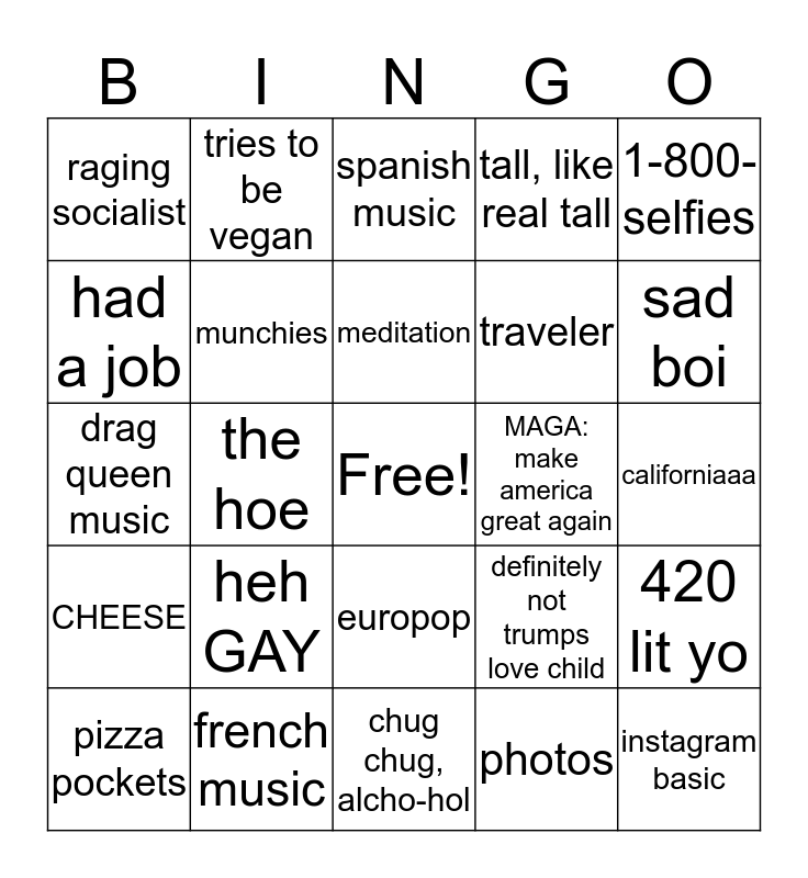 This bingo card has a free space and 24 words: heh GAY, french music, meditation, pizza pockets, 1-800-selfies, raging socialist, had a job, tries to be vegan, MAGA: make america great again, europop, traveler, drag queen music, definitely not trumps love child, 420 lit yo, munchies, photos, californiaaa, spanish music, sad boi, the hoe, instagram basic, CHEESE, tall, like real tall and chug chug, alcho-hol.