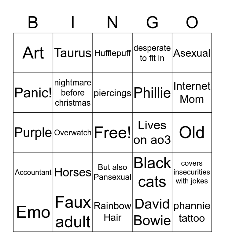 This bingo card has a free space and 24 words: Horses, Faux adult, piercings, Emo, Asexual, Art, Panic!, Taurus, Lives on ao3, But also Pansexual, Phillie, Purple, Black cats, covers insecurities with jokes, nightmare before christmas, David Bowie, Old, Hufflepuff, Internet Mom, Overwatch, phannie tattoo, Accountant, desperate to fit in and Rainbow Hair.