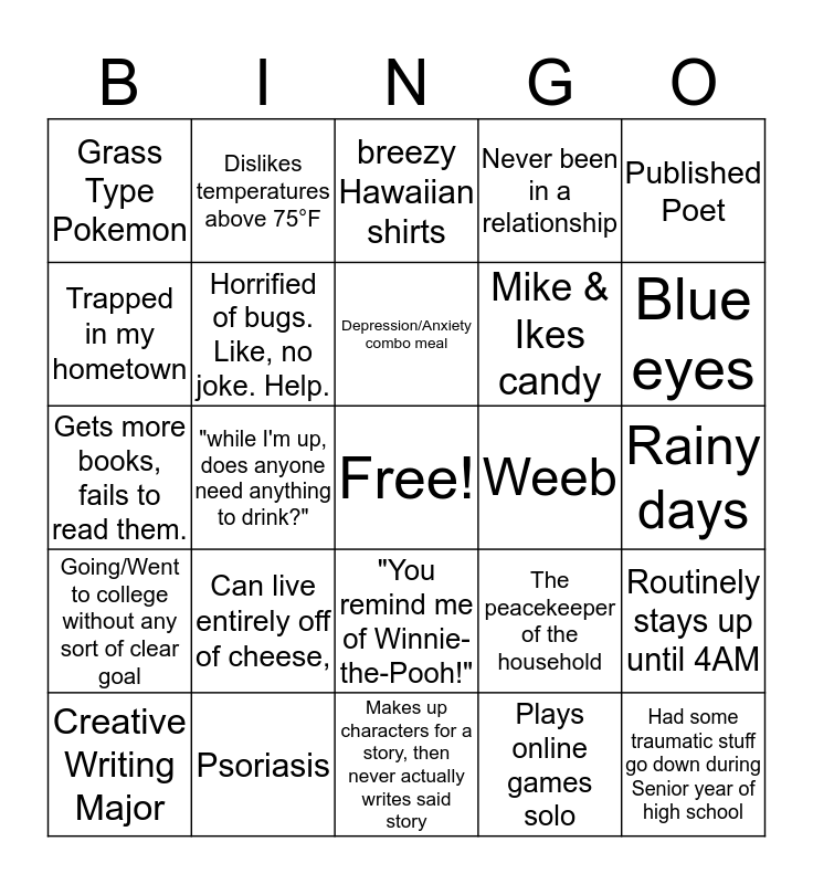 This bingo card has a free space and 24 words: Can live entirely off of cheese,, Psoriasis, Depression/Anxiety combo meal, Creative Writing Major, Published Poet, Grass Type Pokemon, Trapped in my hometown, Dislikes temperatures above 75°F, Weeb, "You remind me of Winnie-the-Pooh!", Mike & Ikes candy, Gets more books, fails to read them., The peacekeeper of the household, Routinely stays up until 4AM, Horrified of bugs. Like, no joke. Help., Plays online games solo, Rainy days, breezy Hawaiian shirts, Blue eyes, "while I'm up, does anyone need anything to drink?", Had some traumatic stuff go down during Senior year of high school, Going/Went to college without any sort of clear goal, Never been in a relationship and Makes up characters for a story, then never actually writes said story.