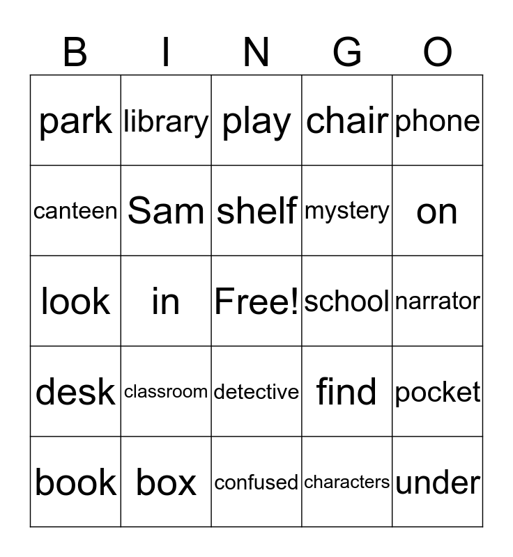 This bingo card has a free space and 24 words: classroom, box, shelf, book, phone, park, canteen, library, school, detective, mystery, look, find, pocket, Sam, characters, narrator, play, on, in, under, desk, chair and confused.