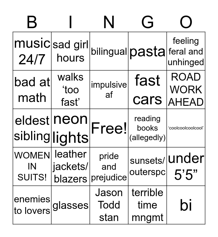 This bingo card has a free space and 24 words: leather jackets/ blazers, glasses, impulsive af, enemies to lovers, feeling feral and unhinged, music 24/7, bad at math, sad girl hours, reading books (allegedly), pride and prejudice, fast cars, eldest sibling, sunsets/ outerspc, under 5’5”, walks ‘too fast’, terrible time mngmt, ‘coolcoolcoolcool’, bilingual, ROAD WORK AHEAD, neon lights, bi, WOMEN IN SUITS!, pasta and Jason Todd stan.