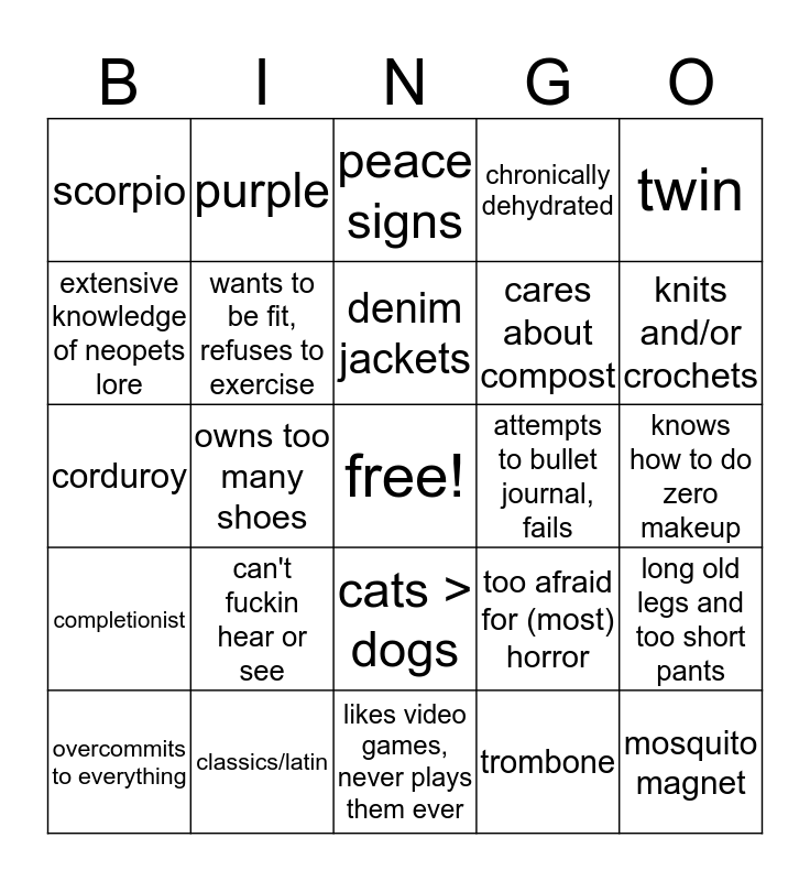 This bingo card has a free space and 24 words: can't fuckin hear or see, classics/latin, denim jackets, overcommits to everything, twin, scorpio, extensive knowledge of neopets lore, purple, attempts to bullet journal, fails, cats > dogs, cares about compost, corduroy, too afraid for (most) horror, long old legs and too short pants, wants to be fit, refuses to exercise, trombone, knows how to do zero makeup, peace signs, knits and/or crochets, owns too many shoes, mosquito magnet, completionist, chronically dehydrated and likes video games, never plays them ever.
