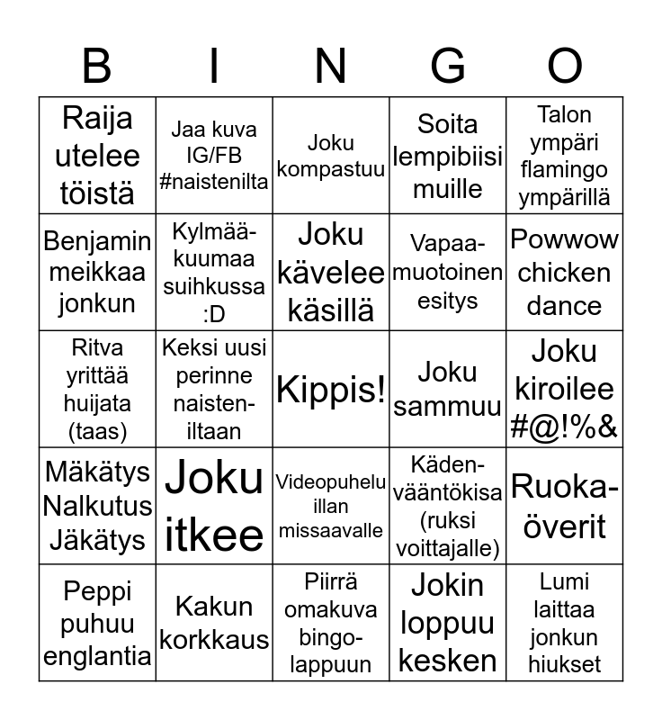 This bingo card has a free space and 24 words: Joku itkee, Kakun korkkaus, Joku kävelee käsillä, Peppi puhuu englantia, Talon ympäri flamingo ympärillä, Raija utelee töistä, Benjamin meikkaa jonkun, Jaa kuva IG/FB #naistenilta, Joku sammuu, Videopuhelu illan missaavalle, Vapaa- muotoinen esitys, Ritva yrittää huijata (taas), Käden-vääntökisa (ruksi voittajalle), Ruoka-överit, Kylmää-kuumaa suihkussa :D, Jokin loppuu kesken, Joku kiroilee #@!%&, Joku kompastuu, Powwow chicken dance, Keksi uusi perinne naisten-iltaan, Lumi laittaa jonkun hiukset, Mäkätys Nalkutus Jäkätys, Soita lempibiisi muille and Piirrä omakuva bingo-lappuun.