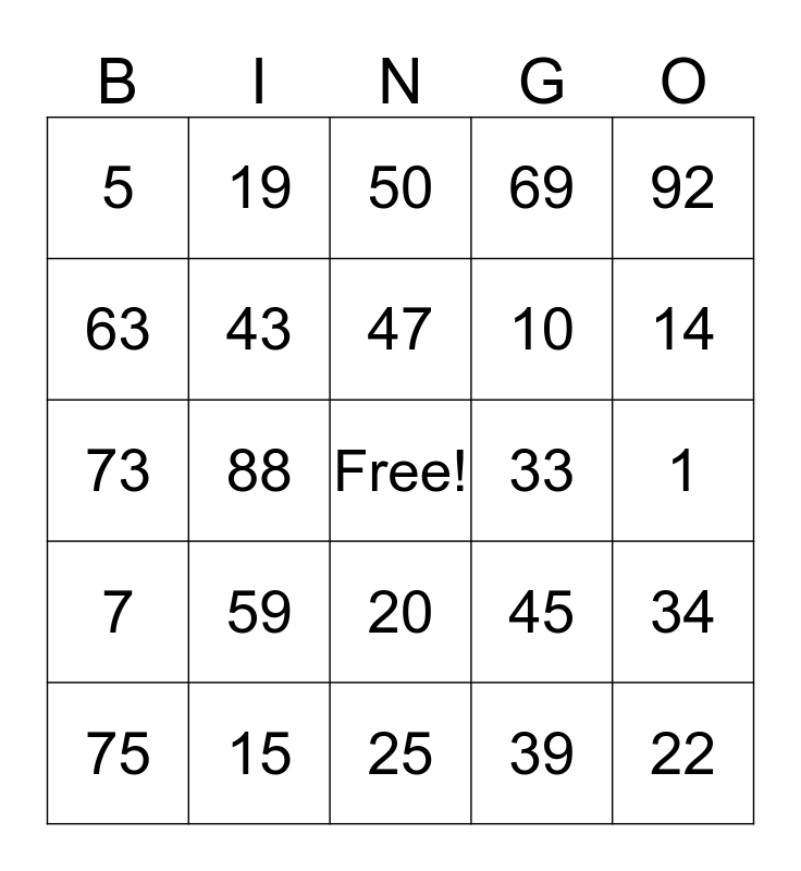 This bingo card has a free space and 24 words: 59, 15, 47, 75, 92, 5, 63, 19, 33, 20, 10, 73, 45, 34, 43, 39, 1, 50, 14, 88, 22, 7, 69 and 25.