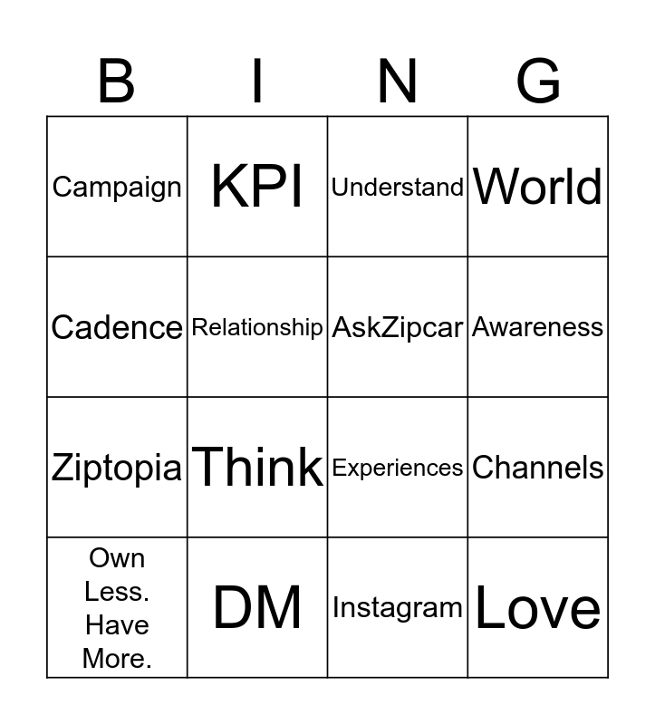 This bingo card has 18 words: Think, Love, Understand, Campaign, Experiences, World, Own Less. Have More., KPI, Awareness, Ziptopia, Instagram, Cadence, Channels, Relationship, AskZipcar, Influencers, DM and Kait.