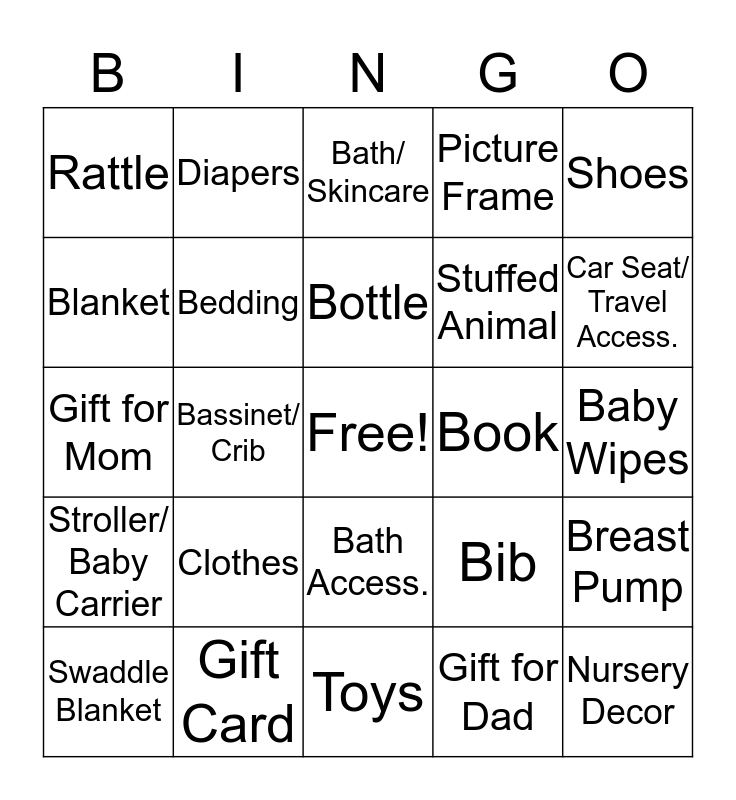This bingo card has a free space and 24 words: Clothes, Gift Card, Bottle, Swaddle Blanket, Shoes, Rattle, Blanket, Diapers, Book, Bath Access., Stuffed Animal, Gift for Mom, Bib, Breast Pump, Bedding, Gift for Dad, Baby Wipes, Bath/ Skincare, Car Seat/ Travel Access., Bassinet/ Crib, Nursery Decor, Stroller/ Baby Carrier, Picture Frame and Toys.