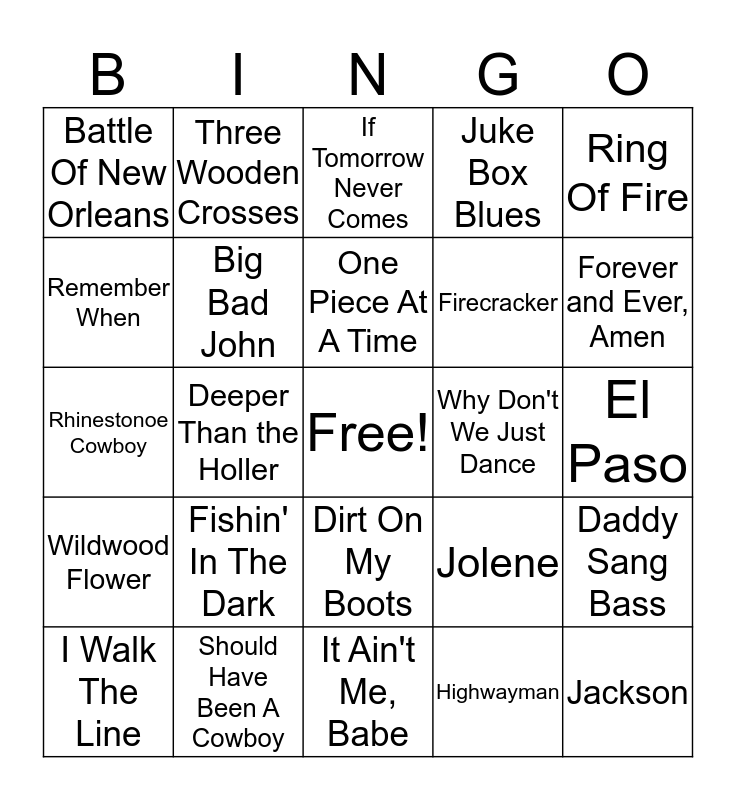 This bingo card has a free space and 24 words: Fishin' In The Dark, Should Have Been A Cowboy, One Piece At A Time, I Walk The Line, Ring Of Fire, Battle Of New Orleans, Remember When, Three Wooden Crosses, Why Don't We Just Dance, Dirt On My Boots, Firecracker, Rhinestonoe Cowboy, Jolene, Daddy Sang Bass, Big Bad John, Highwayman, El Paso, If Tomorrow Never Comes, Forever and Ever, Amen, Deeper Than the Holler, Jackson, Wildwood Flower, Juke Box Blues and It Ain't Me, Babe.