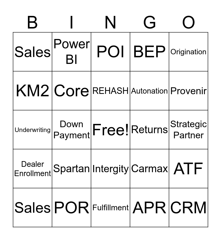 This bingo card has a free space and 35 words: Hertz, Loans, Bank Statements, Core, Intergity, BEP, KM2, DOT, REHASH, Titles, Underwriting, Origination, Humility, Partnership, Sales, Returns, APR, Down Payment, Dealer Enrollment, CRM, Carmax, Sales, ATF, POR, POI, Provenir, CIT, Funding, Autonation, Strategic Partner, Net Check, Fulfillment, Spartan, Power BI and Guiding Principles.