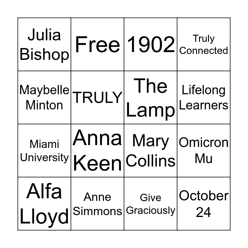 This bingo card has 20 words: Omicron Mu, Delta Zeta, 1902, JAMAMA, Alfa Lloyd, Maybelle Minton, Anne Simmons, Julia Bishop, Miami University, Free, Anna Keen, Mary Collins, TRULY, October 24, The Lamp, Oxford, OH, Lifelong Learners, Truly Connected, Give Graciously and Starkey Hearing Foundation.