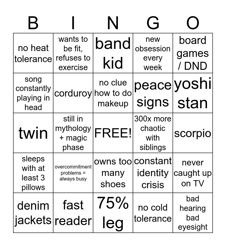This bingo card has a free space and 24 words: overcommitment problems = always busy, fast reader, no clue how to do makeup, denim jackets, board games / DND, no heat tolerance, song constantly playing in head, wants to be fit, refuses to exercise, 300x more chaotic with siblings, owns too many shoes, peace signs, twin, constant identity crisis, never caught up on TV, corduroy, no cold tolerance, scorpio, band kid, yoshi stan, still in mythology + magic phase, bad hearing bad eyesight, sleeps with at least 3 pillows, new obsession every week and 75% leg.