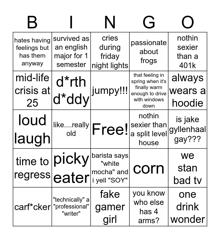 This bingo card has a free space and 24 words: picky eater, "technically" a "professional" "writer", jumpy!!!, carf*cker, nothin sexier than a 401k, hates having feelings but has them anyway, mid-life crisis at 25, survived as an english major for 1 semester, nothin sexier than a split level house, barista says "white mocha" and i yell "SOY", that feeling in spring when it's finally warm enough to drive with windows down, loud laugh, corn, we stan bad tv, d*rth d*ddy, you know who else has 4 arms?, is jake gyllenhaal gay???, cries during friday night lights, always wears a hoodie, like....really old, one drink wonder, time to regress, passionate about frogs and fake gamer girl.