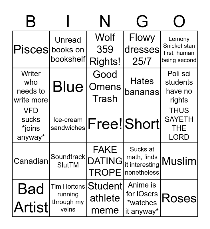 This bingo card has a free space and 24 words: Soundtrack SlutTM, Tim Hortons running through my veins, Good Omens Trash, Bad Artist, Lemony Snicket stan first, human being second, Pisces, Writer who needs to write more, Unread books on bookshelf, Short, FAKE DATING TROPE, Hates bananas, VFD sucks *joins anyway*, Sucks at math, finds it interesting nonetheless, Muslim, Blue, Anime is for lOsers *watches it anyway*, THUS SAYETH THE LORD, Wolf 359 Rights!, Poli sci students have no rights, Ice-cream sandwiches, Roses, Canadian, Flowy dresses 25/7 and Student athlete meme.