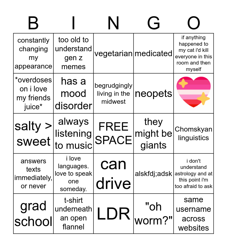 This bingo card has 1 images, a free space and 23 words: i love languages. love to speak one someday., t-shirt underneath an open flannel, begrudgingly living in the midwest, grad school, if anything happened to my cat i'd kill everyone in this room and then myself, constantly changing my appearance, *overdoses on i love my friends juice*, too old to understand gen z memes, they might be giants, can drive, neopets, salty > sweet, alskfdj;adsk, i don't understand astrology and at this point i'm too afraid to ask, has a mood disorder, "oh worm?", Chomskyan linguistics, vegetarian, always listening to music, same username across websites, answers texts immediately, or never, medicated and LDR.