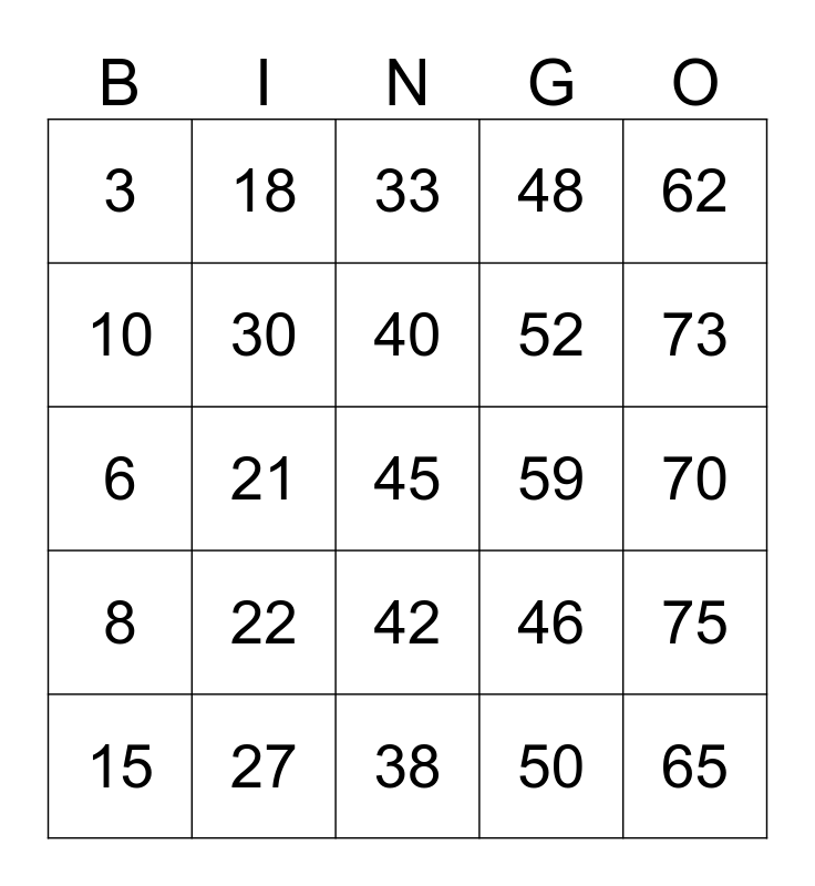 This bingo card has 25 words: 8, 27, 45, 50, 62, 3, 18, 33, 59, 75, 10, 30, 38, 46, 73, 15, 21, 40, 52, 70, 6, 22, 42, 48 and 65.