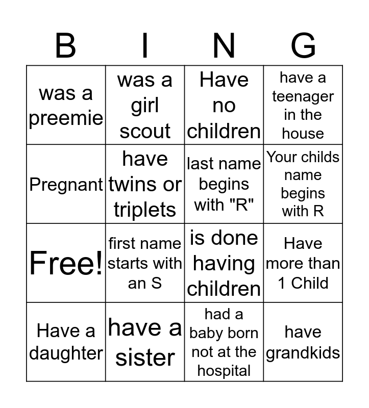 This bingo card has 20 words: Have more than 1 Child, Had a C Section, Have no children, Have a son, Have a daughter, Pregnant, have a sister, was a preemie, Free!, was a girl scout, first name starts with an S, is done having children, have twins or triplets, have grandkids, last name begins with "R", Drive a mini van, Your childs name begins with R, have a teenager in the house, had a baby born not at the hospital and share bed with 2 or more persons.
