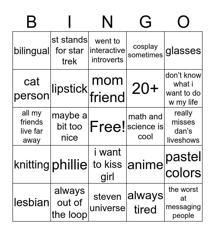 This bingo card has a free space and 24 words: phillie, always out of the loop, mom friend, lesbian, glasses, bilingual, cat person, st stands for star trek, math and science is cool, i want to kiss girl, 20+, all my friends live far away, anime, pastel colors, lipstick, always tired, really misses dan’s liveshows, went to interactive introverts, don’t know what i want to do w my life, maybe a bit too nice, the worst at messaging people, knitting, cosplay sometimes and steven universe.