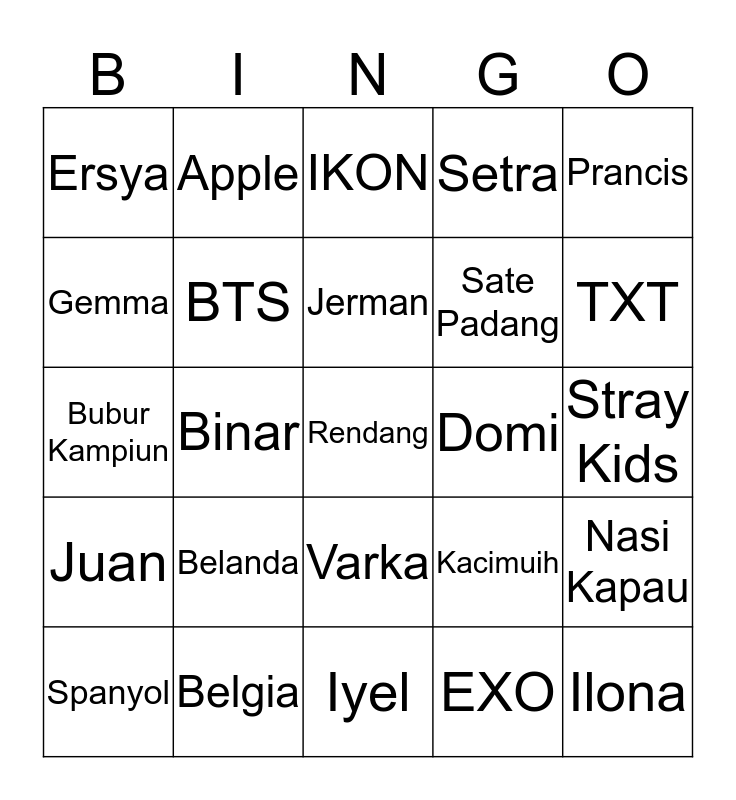 This bingo card has a free space and 24 words: Belanda, Belgia, Jerman, Spanyol, Prancis, Ersya, Gemma, Apple, Domi, Varka, Sate Padang, Bubur Kampiun, Kacimuih, Nasi Kapau, BTS, EXO, Stray Kids, IKON, TXT, Binar, Ilona, Juan, Setra and Iyel.