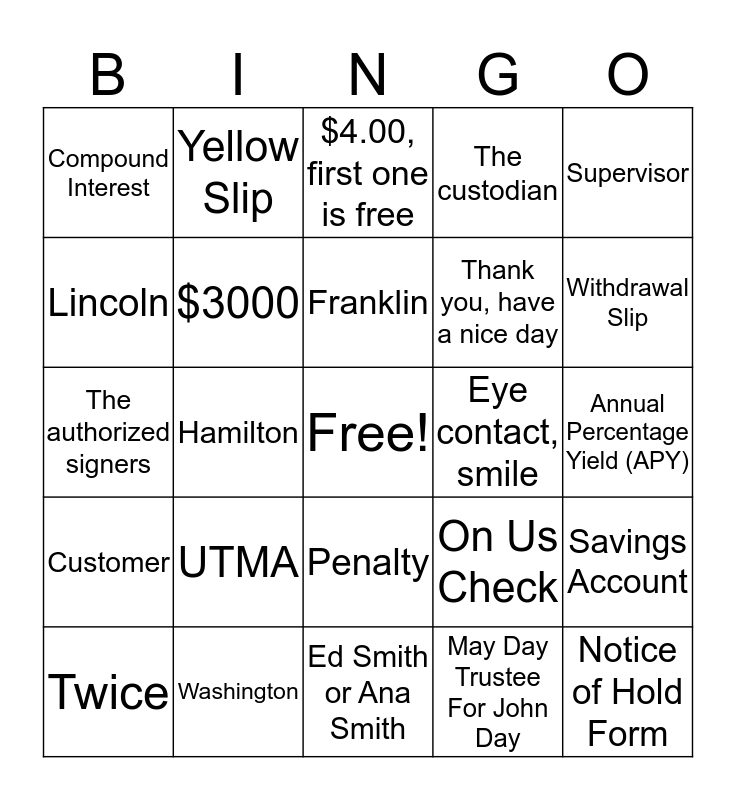 This bingo card has a free space and 31 words: Ed Smith or Ana Smith, Next business day, Hamilton, Cash, Wires, Official Checks, Compound Interest, $4.00, first one is free, $3000, On Us Check, Eye contact, smile, May Day Trustee For John Day, Annual Percentage Yield (APY), Notice of Hold Form, $2.00 each, Checking Account, Withdrawal Slip, Jackson, Savings Account, UTMA, Customer, Penalty, Supervisor, $33.00, Twice, Yellow Slip, Thank you, have a nice day, Lincoln, The custodian, The authorized signers, Washington, Franklin and Grant.