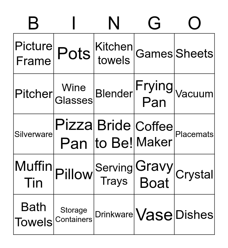 This bingo card has a free space and 34 words: Knives, Vase, Baking Sheet, Salt & Pepper Shaker, Muffin Tin, Wine Glasses, Sheets, Bath Towels, Pots, Toaster, Blender, Kitchen towels, Blanket, Serving Bowl, Coffee Maker, Vacuum, Storage Containers, Silverware, Pillow, Gravy Boat, Serving Trays, Umbrella, Picture Frame, Placemats, Drinkware, Dishes, Games, Grilling Tools, Frying Pan, Pitcher, Cookbook, Pizza Pan, Crystal and Pot Holders.