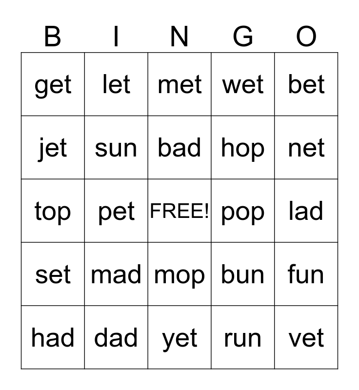 This bingo card has a free space and 24 words: mad, dad, bad, had, bet, get, jet, let, pop, mop, hop, top, bun, fun, sun, run, lad, met, net, pet, vet, set, wet and yet.