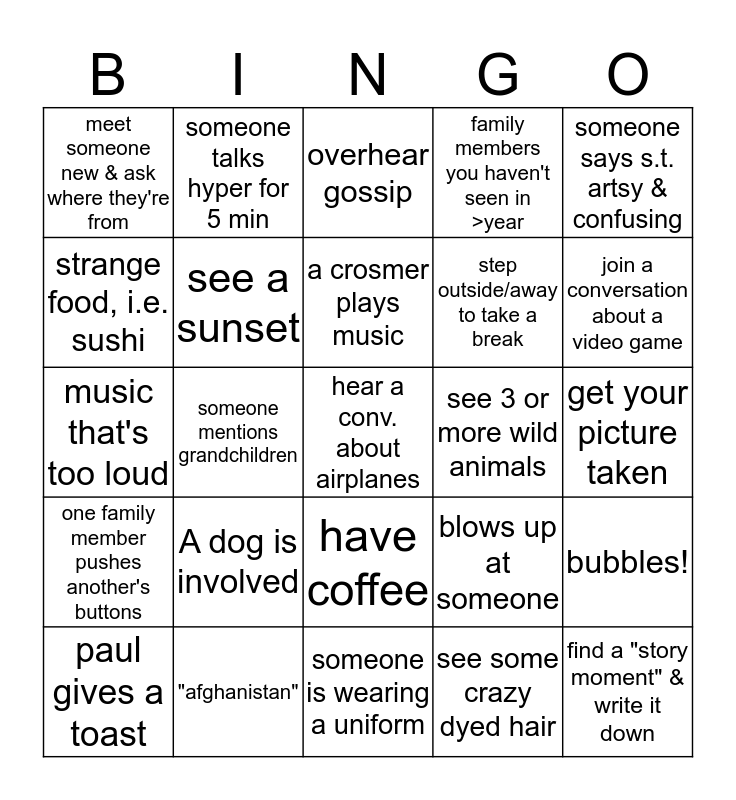This bingo card has 25 words: A dog is involved, someone is wearing a uniform, a crosmer plays music, paul gives a toast, someone says s.t. artsy & confusing, meet someone new & ask where they're from, strange food, i.e. sushi, someone talks hyper for 5 min, see 3 or more wild animals, have coffee, step outside/away to take a break, music that's too loud, blows up at someone, bubbles!, see a sunset, find a "story moment" & write it down, get your picture taken, overhear gossip, join a conversation about a video game, someone mentions grandchildren, hear a conv. about airplanes, "afghanistan", one family member pushes another's buttons, family members you haven't seen in >year and see some crazy dyed hair.