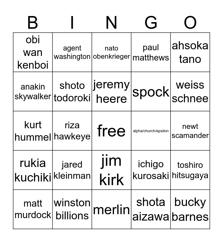 This bingo card has a free space and 24 words: jared kleinman, winston billions, jeremy heere, matt murdock, ahsoka tano, obi wan kenboi, anakin skywalker, agent washington, alpha/church/epsilon, jim kirk, spock, kurt hummel, ichigo kurosaki, toshiro hitsugaya, shoto todoroki, shota aizawa, newt scamander, nato obenkrieger, weiss schnee, riza hawkeye, bucky barnes, rukia kuchiki, paul matthews and merlin.