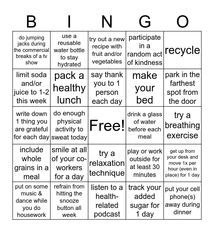 This bingo card has a free space and 24 words: smile at all of your co-workers for a day, refrain from hitting the snooze button all week, say thank you to 1 person each day, put on some music & dance while you do housework, recycle, do jumping jacks during the commercial breaks of a tv show, limit soda and/or juice to 1-2 this week, use a reusable water bottle to stay hydrated, drink a glass of water before each meal, try a relaxation technique, make your bed, write down 1 thing you are grateful for each day, play or work outside for at least 30 minutes, get up from your desk and move 1x per hour (even in place) for 1 day, pack a healthy lunch, track your added sugar for 1 day, try a breathing exercise, try out a new recipe with fruit and/or vegetables, park in the farthest spot from the door, do enough physical activity to sweat today, put your cell phone(s) away during dinner, include whole grains in a meal, participate in a random act of kindness and listen to a health-related podcast.