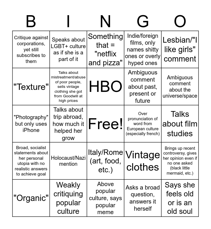 This bingo card has a free space and 26 words: Italy/Rome (art, food, etc.), Asks a broad question, answers it herself, HBO, Weakly critiquing popular culture, Lesbian/"I like girls" comment, Critique against corporations, yet still subscribes to them, "Texture", Speaks about LGBT+ culture as if she is a part of it, Talks about film studies, Vintage clothes, Ambiguous comment about past, present or future, "Photography" but only uses iPhone, Brings up recent controversy, gives her opinion even if no one asked (black little mermaid, etc.), "Organic", Talks about trip abroad, how much it helped her grow, Uses large word unnecessarily (ex. raucous instead of crazy), Indie/foreign films, only names shitty ones or overly hyped ones, Broad, socialist statements about her personal utopia with no realistic answers to achieve goal, Something that = "netflix and pizza", Says she feels old or is an old soul, Ambiguous comment about the universe/space, Above popular culture, says popular meme, Over pronunciation of word from European culture (especially french), Holocaust/Nazi mention, Talks about mistreatment/abuse of poor people, sells vintage clothing she got from Goodwill at high prices and Keanu Reeves.