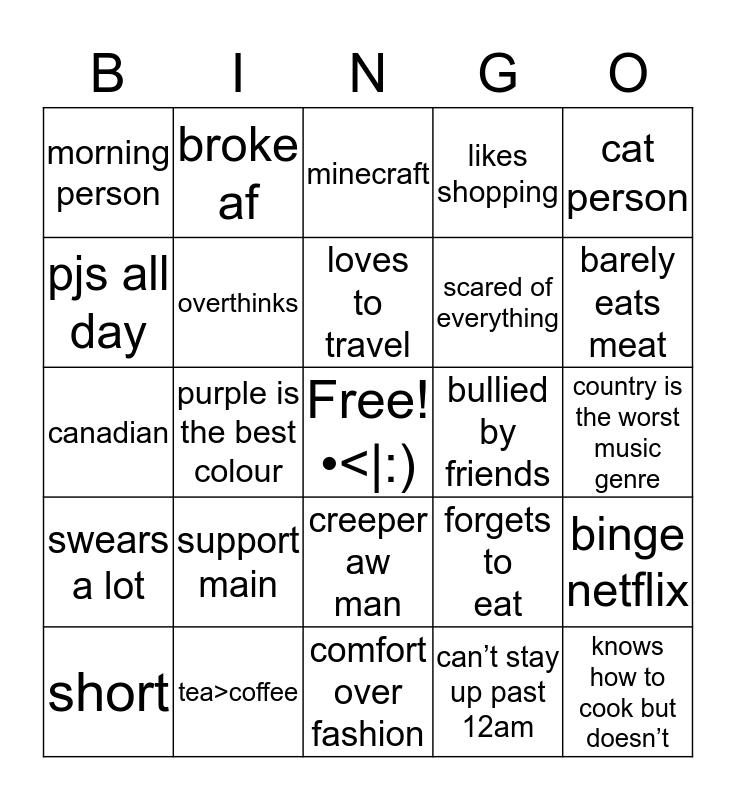 This bingo card has a free space and 24 words: support main, tea>coffee, loves to travel, short, cat person, morning person, pjs all day, broke af, bullied by friends, creeper aw man, scared of everything, canadian, forgets to eat, binge netflix, overthinks, can’t stay up past 12am, country is the worst music genre, minecraft, barely eats meat, purple is the best colour, knows how to cook but doesn’t, swears a lot, likes shopping and comfort over fashion.
