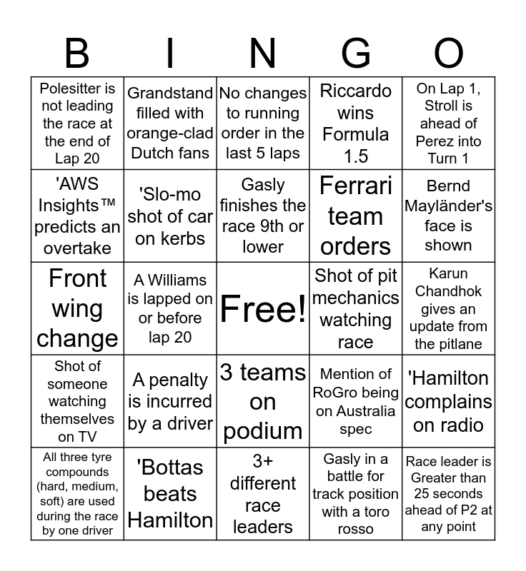 This bingo card has a free space and 24 words: A penalty is incurred by a driver, 'Bottas beats Hamilton, Gasly finishes the race 9th or lower, All three tyre compounds (hard, medium, soft) are used during the race by one driver, On Lap 1, Stroll is ahead of Perez into Turn 1, Polesitter is not leading the race at the end of Lap 20, 'AWS Insights™ predicts an overtake, Grandstand filled with orange-clad Dutch fans, Shot of pit mechanics watching race, 3 teams on podium, Ferrari team orders, Front wing change, Mention of RoGro being on Australia spec, 'Hamilton complains on radio, 'Slo-mo shot of car on kerbs, Gasly in a battle for track position with a toro rosso, Karun Chandhok gives an update from the pitlane, No changes to running order in the last 5 laps, Bernd Mayländer's face is shown, A Williams is lapped on or before lap 20, Race leader is Greater than 25 seconds ahead of P2 at any point, Shot of someone watching themselves on TV, Riccardo wins Formula 1.5 and 3+ different race leaders.