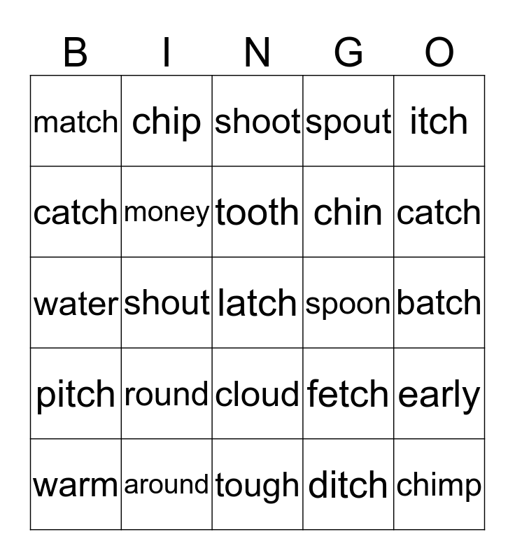 This bingo card has a free space and 24 words: round, around, tooth, warm, itch, match, catch, chip, spoon, cloud, chin, water, fetch, early, money, ditch, batch, shoot, catch, shout, chimp, pitch, spout and tough.
