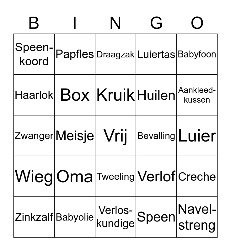 This bingo card has a free space and 34 words: Kinder- wagen, Speen, Huilbaby, Badje, Wieg, Box, Babyfoon, Zinkzalf, Papfles, Wipstoel, Kruik, Draagzak, Baby- kamer, Slabbetje, Bevalling, Aankleed- kussen, Babyolie, Zwanger, Oma, Verlof, Tweeling, Geboorte, Speen- koord, Luier, Verlos-kundige, Navel- streng, Luiertas, Kolven, Huilen, Haarlok, Jongetje, Meisje, Creche and Echo.