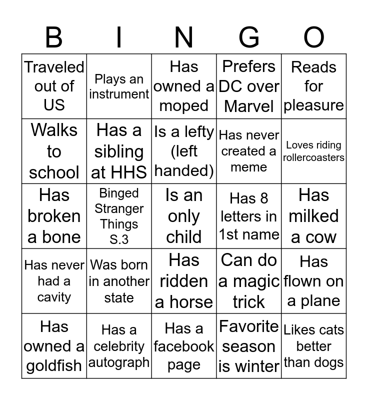 This bingo card has a free space and 24 words: Was born in another state, Has a celebrity autograph, Is a lefty (left handed), Has owned a goldfish, Reads for pleasure, Traveled out of US, Walks to school, Plays an instrument, Has 8 letters in 1st name, Has ridden a horse, Has never created a meme, Has broken a bone, Can do a magic trick, Has flown on a plane, Has a sibling at HHS, Favorite season is winter, Has milked a cow, Has owned a moped, Loves riding rollercoasters, Binged Stranger Things S.3, Likes cats better than dogs, Has never had a cavity, Prefers DC over Marvel and Has a facebook page.