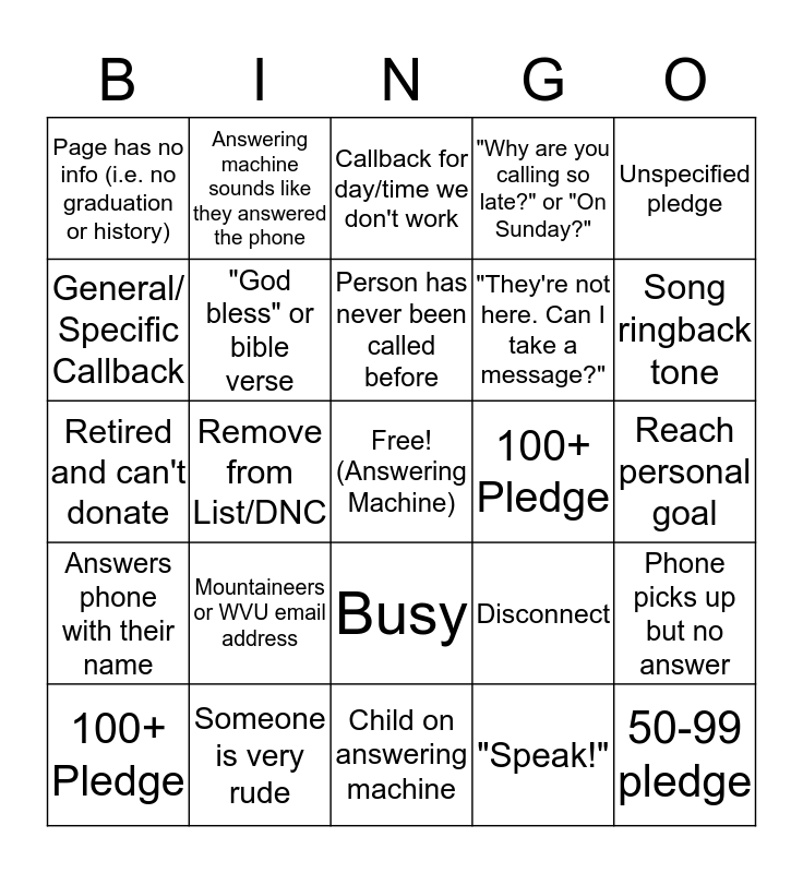 This bingo card has a free space and 29 words: 100+ Pledge, Aloha/ Animal noise answering machine, Remove from List/DNC, Bot, Page has no info (i.e. no graduation or history), Callback for day/time we don't work, "God bless" or bible verse, Mountaineers or WVU email address, 100+ Pledge, Someone is very rude, Reach personal goal, 50-99 pledge, Child on answering machine, "Speak!", Song ringback tone, Fax machine, Busy, Answers phone with their name, Unspecified pledge, Retired and can't donate, Disconnect, 1-49 pledge, "They're not here. Can I take a message?", General/ Specific Callback, "Why are you calling so late?" or "On Sunday?", Answering machine sounds like they answered the phone, Phone picks up but no answer, Person has never been called before and Doctor/ Colonel/ Reverend/ Title other than Mr., Mrs., Ms. or Miss.