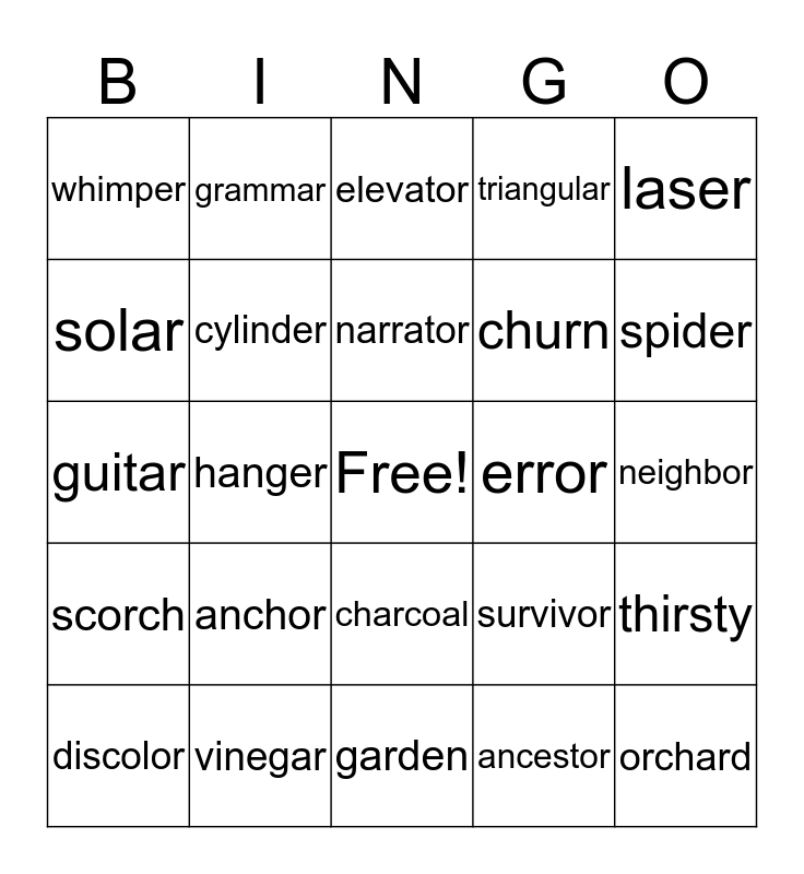 This bingo card has a free space and 24 words: anchor, vinegar, narrator, discolor, laser, whimper, solar, grammar, error, charcoal, churn, guitar, survivor, thirsty, cylinder, ancestor, neighbor, elevator, spider, hanger, orchard, scorch, triangular and garden.