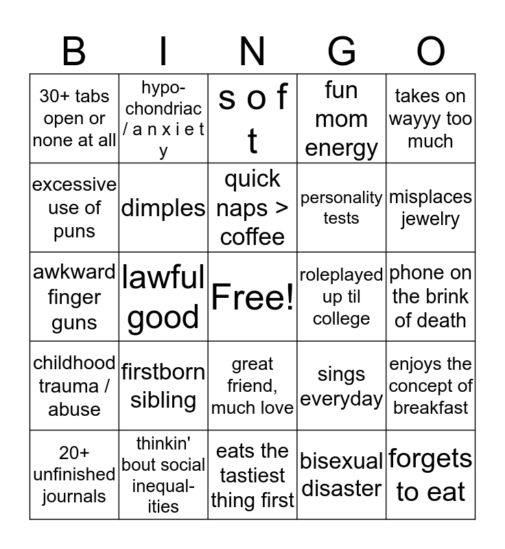 This bingo card has a free space and 24 words: firstborn sibling, thinkin' bout social inequal-ities, quick naps > coffee, 20+ unfinished journals, takes on wayyy too much, 30+ tabs open or none at all, excessive use of puns, hypo-chondriac / a n x i e t y, roleplayed up til college, great friend, much love, personality tests, awkward finger guns, sings everyday, enjoys the concept of breakfast, dimples, bisexual disaster, phone on the brink of death, s o f t, misplaces jewelry, lawful good, forgets to eat, childhood trauma / abuse, fun mom energy and eats the tastiest thing first.