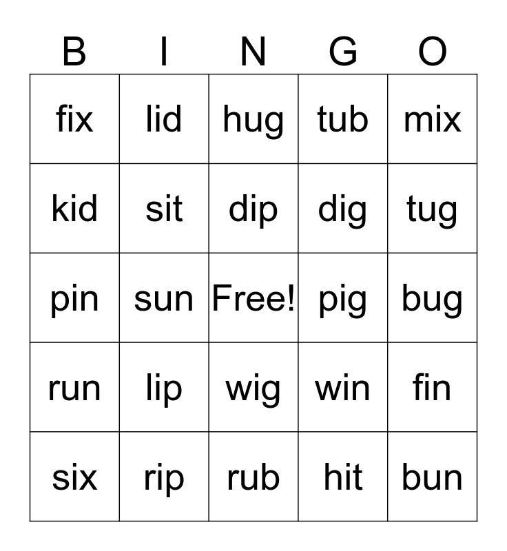 This bingo card has a free space and 24 words: lip, rip, dip, six, mix, fix, kid, lid, pig, wig, dig, pin, win, fin, sit, hit, bug, hug, tug, sun, bun, run, tub and rub.